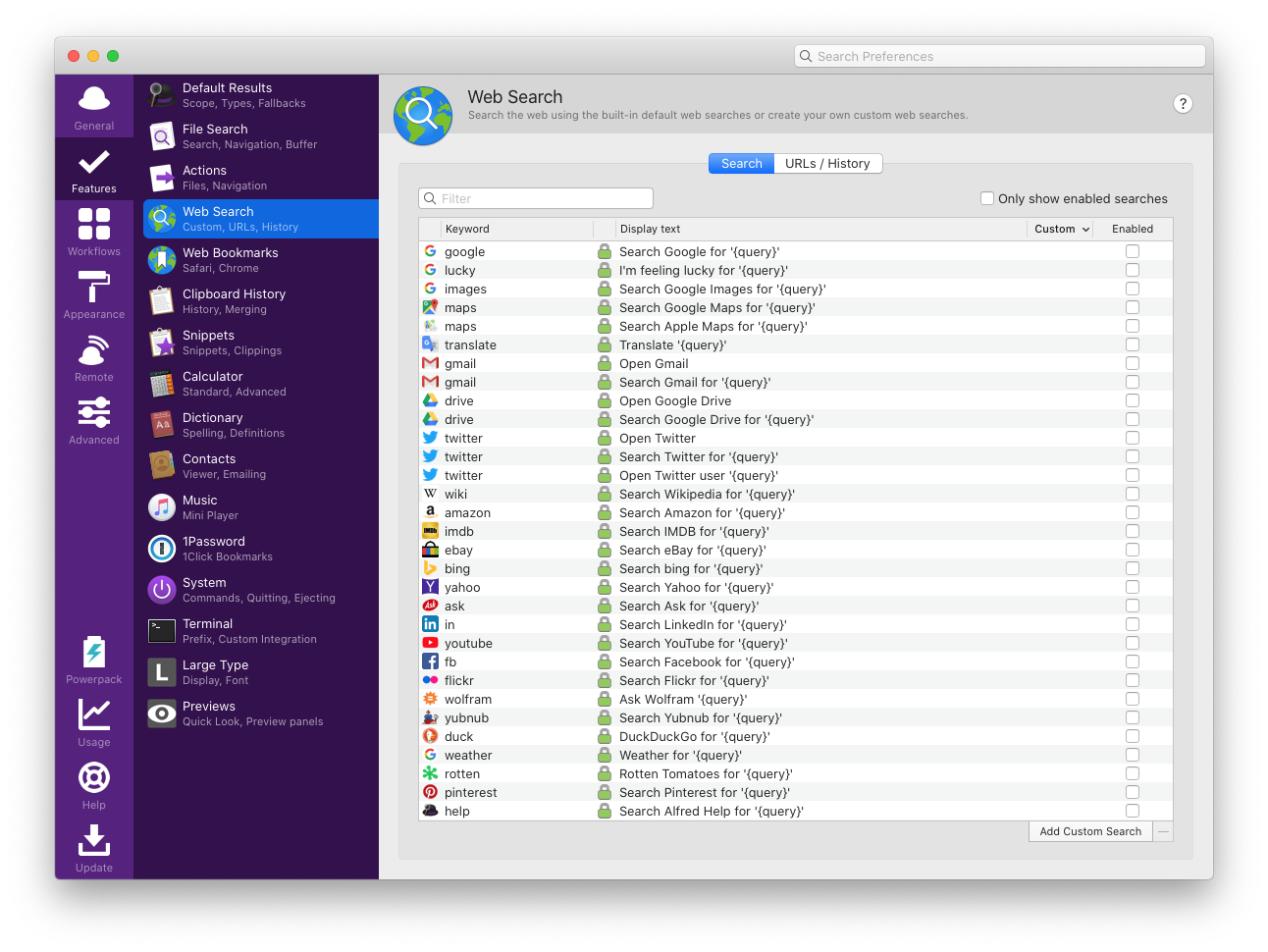 In the included README file, there’s also a handy list of install links for the default searches to make it easy to add replacement searches in Alfred. Everything you need to know is included.