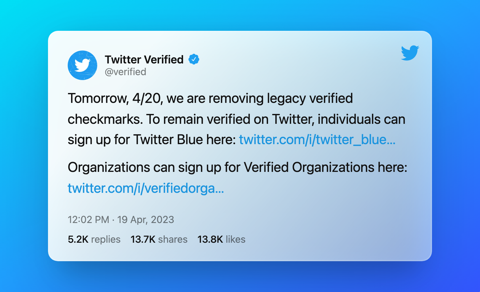 Since I was unwilling to pay, my legacy blue check would expire on April 20 — “4/20” — the date Elon would execute the blue check aristocracy.